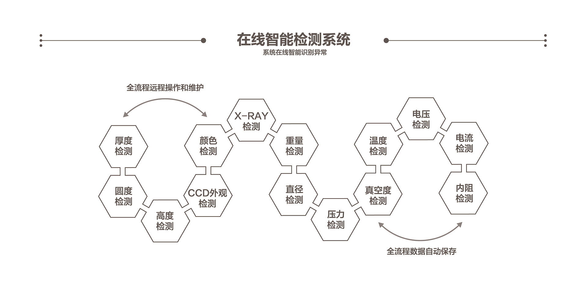 我们将组立工程和充放电工程全流程集成一条高速全自动、智能化功效于一体的产线。。。。。。使用网络手艺将产线内装备盘算机系统有用毗连,,,,,,,信息智能交互,,,,,,,将人、机、料、法、情形、供应链直到治理高效的融合到一起,,,,,,,从原质推测产品制造、仓储、产品出货,,,,,,,智能纪录数据并剖析评估最优的解决计划。。。。。。